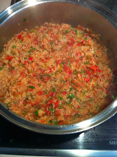 2. Σε μια βαθιά κατσαρόλα ζεσταίνουμε το ελαιόλαδο και σοτάρουμε το κρεμμύδι, τις πιπεριές, το σκόρδο και το ρύζι σε δυνατή φωτιά.